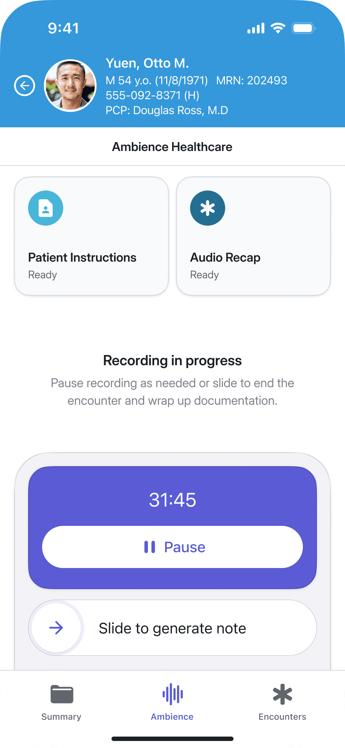 Ambience lets you practice medicine the way you always intended: focused, present, and clinically sharp. It captures the encounter as it happens, organizes your notes in real time, and helps ensure you're meeting clinical standards without staying late or cutting corners.