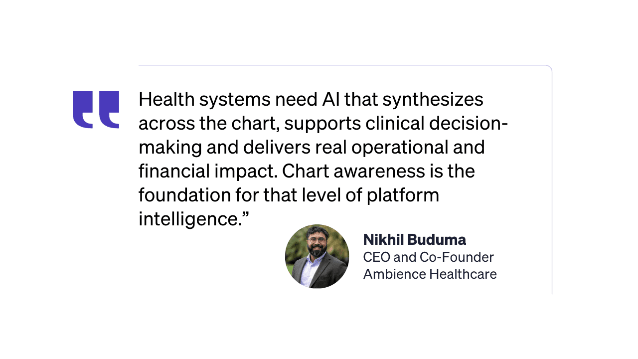 For an oncologist, a workflow that isn’t grounded in the full longitudinal chart simply doesn’t work, because critical decisions depend on years of evolving labs, imaging, notes, and treatment history. For RCM and compliance teams, chart awareness provides the audit trail and contextual grounding required to trust every suggested diagnosis and code, rather than relying on predictions from incomplete information. Together, this transforms Ambience from a point solution into a single intelligence layer that clinicians love using and revenue leaders can depend on to strengthen both care quality and financial performance.
